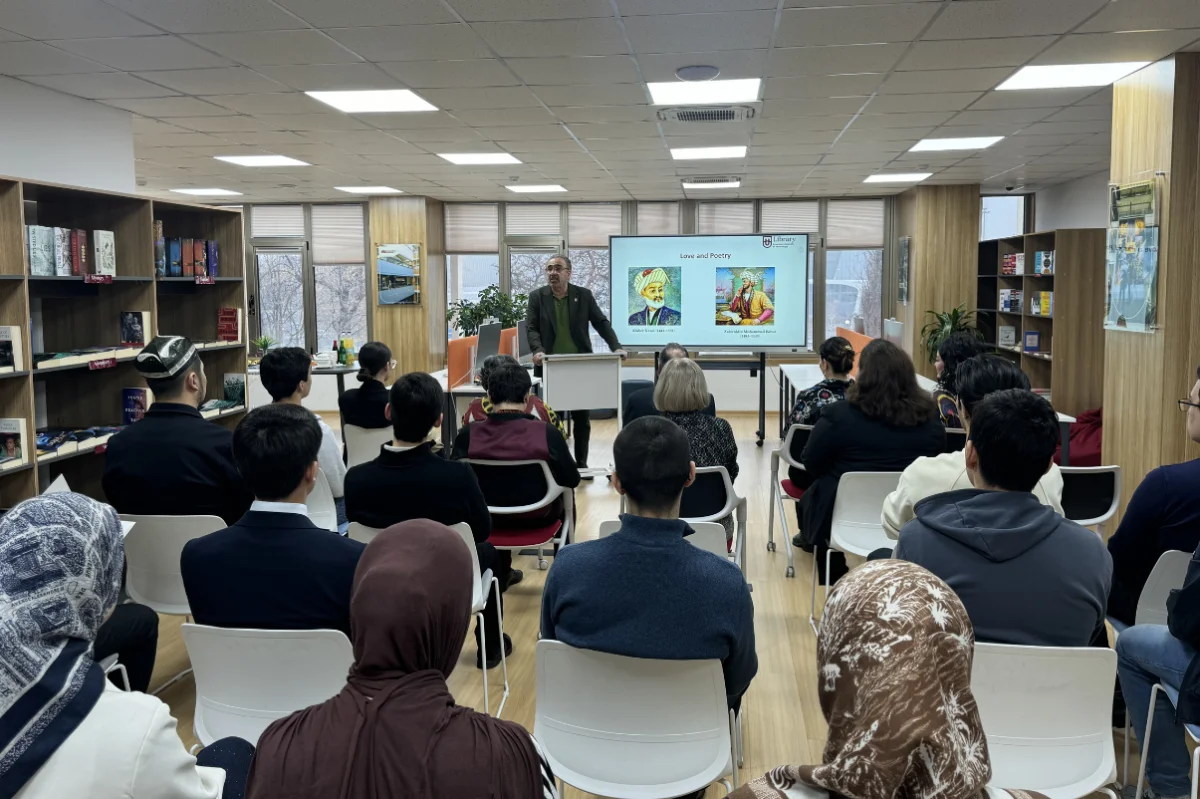 Students, faculty, and our distinguished guests — Founding President Dr. Rick Shangraw and Founding Rector Prof. Dr. Said Irandoust — gathered to celebrate the enduring literary legacy of Alisher Navoi and Zahiriddin Muhammad Babur.